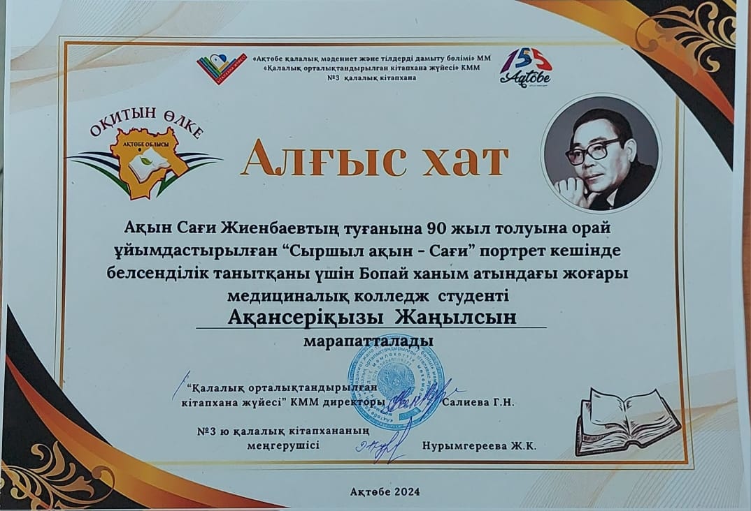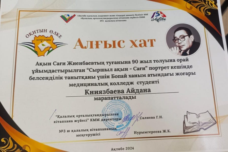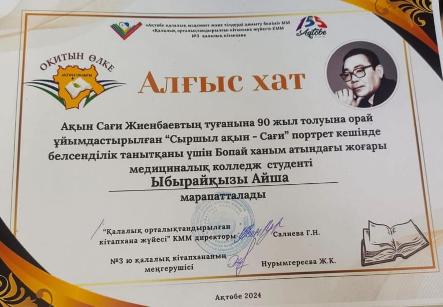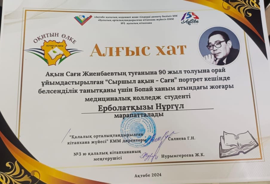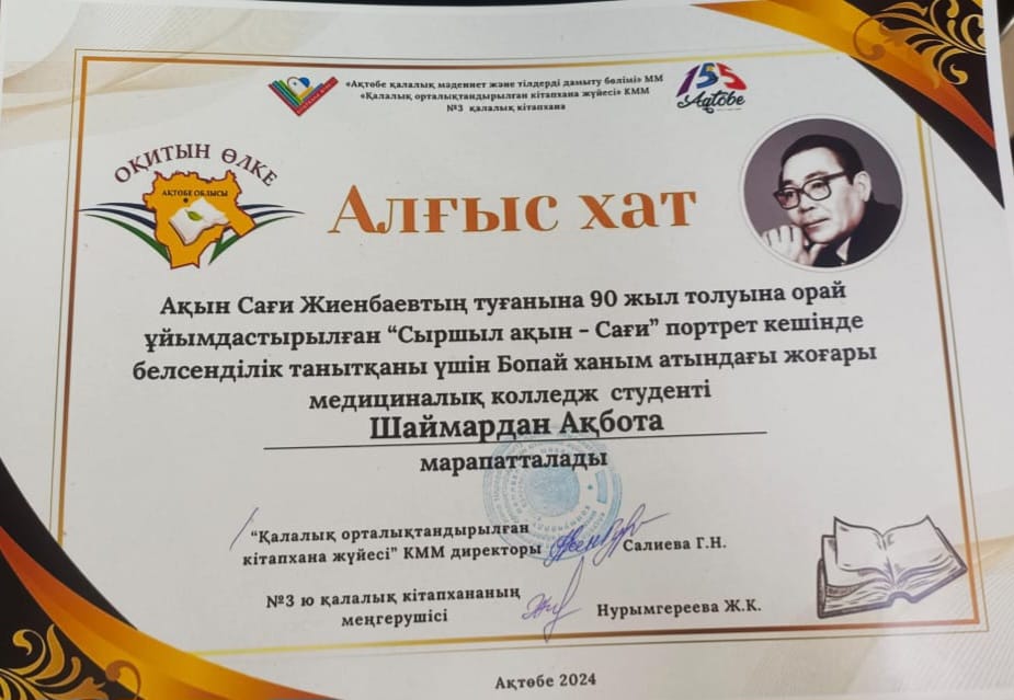 Бопай ханым жоғары медициналық колледжі №4 М.Горький атындағы қалалық кітапханамен бірлесе отырып, ақын Сағи Жиенбаевтың туғанына 90 жыл толуына орай «Сыршыл ақын-Сағи» атты портрет кешін өткізді. Осы аталған конкурсқа біздің колледжден «Мейіргер ісі » 223 тобының білім алушылары Князбаева А., Ыбырайқызы А., Ерболатқызы Н., Шаймардан А., Ақансеріқызы Ж. қатысты.