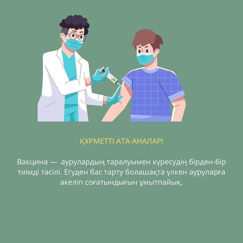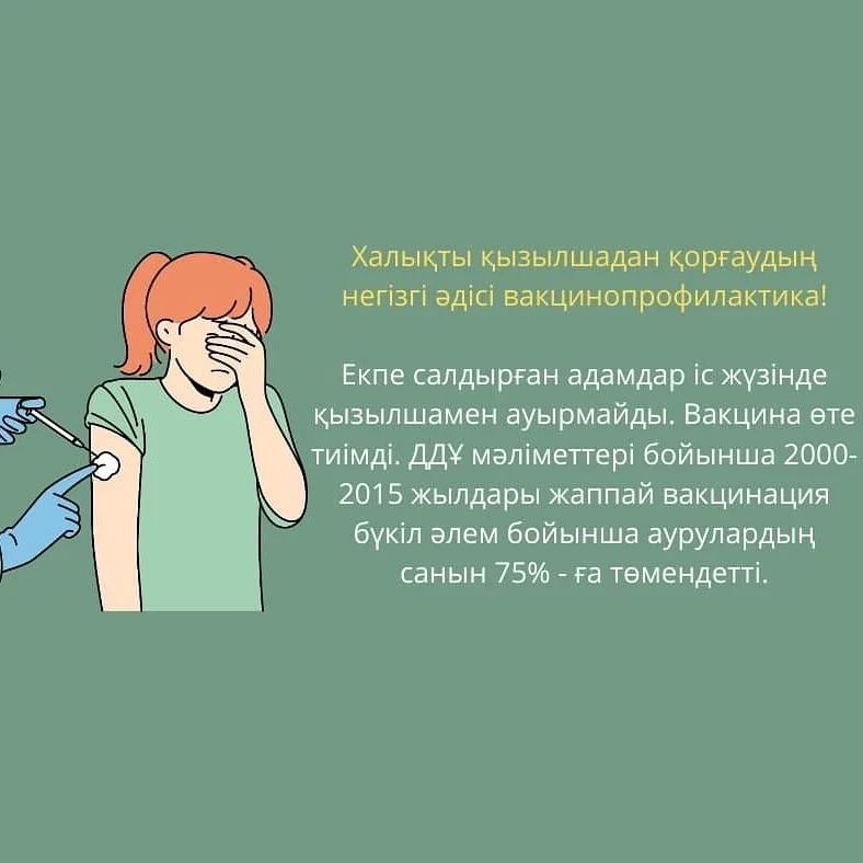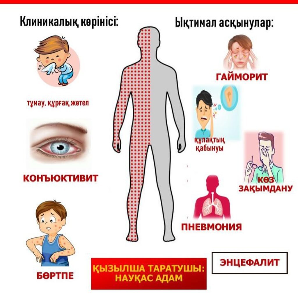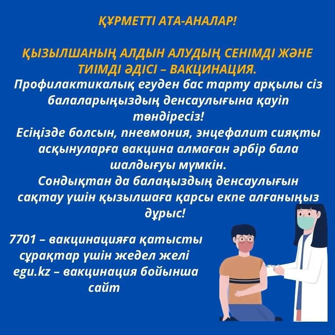 Вакцинациядан бас тартпаңыз! Қызылша асқынуларымен қауіпті! Тек уақтылы жасалған вакцинация инфекциядан қорғайды! Балаларыңыз бен жақын адамдарыңыздың денсаулығына қамқор болыңыз!