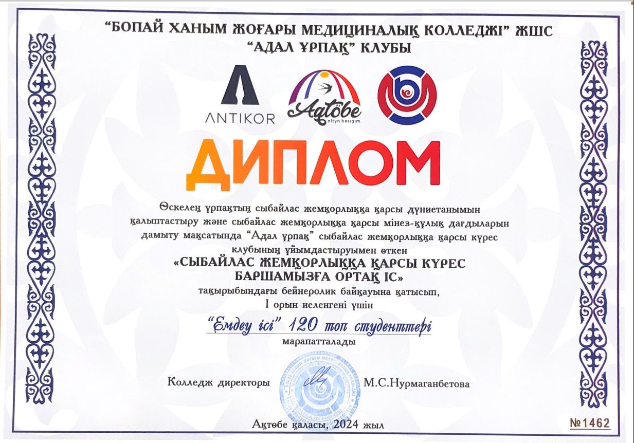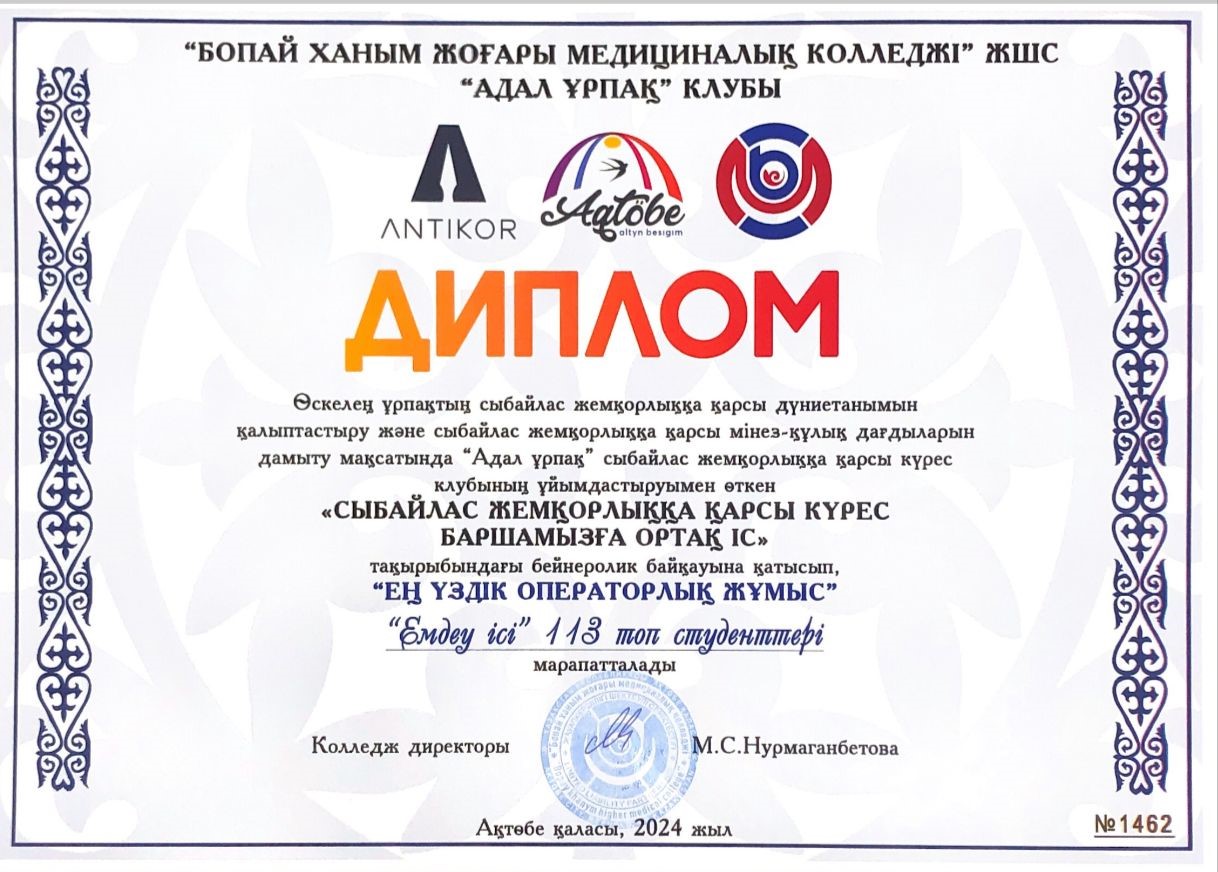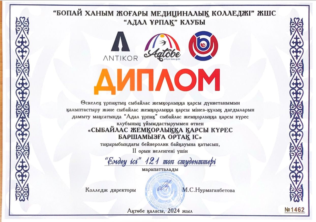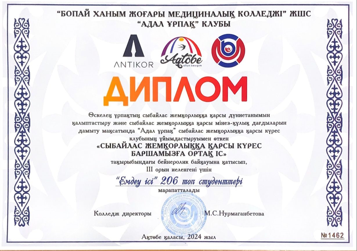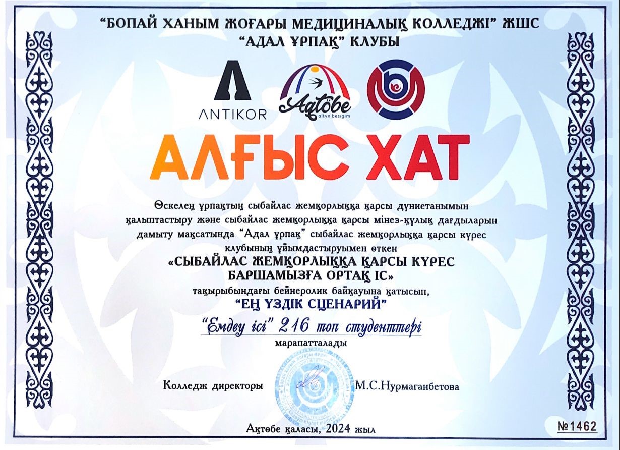 26.02.2024-13.03.2024 аралығында Бопай ханым жоғары медициналық колледжінің студенттері арасында «Сыбайлас жемқорлыққа қарсы күрес баршамызға ортақ іс» тақырыбындағы бейнеролик байқауы өткізілді. Байқау сыбайлас жемқорлыққа қарсы күрес мәселелері, жемқорлыққа қарсы тақырыптар бойынша азаматтардың сыбайлас жемқорлыққа төзбеушілік мәдениетін көтеру, қоғамдағы сыбайластыққа қарсы көзқарасты қалыптастыратын құндылықтар жүйесін сақтап, нығыздау мақсатында өткізілген болатын.